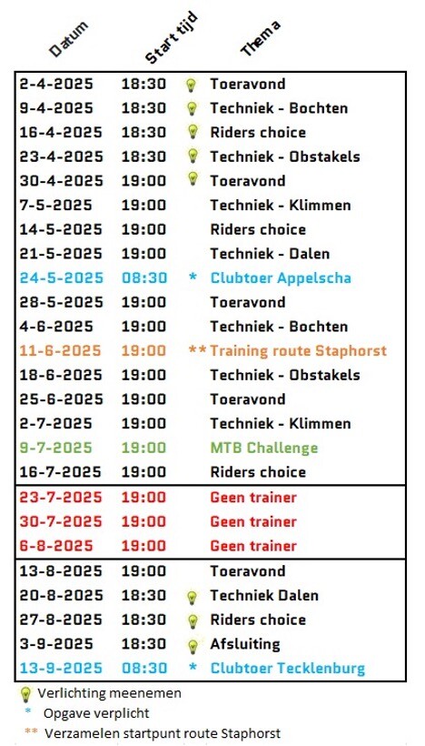 Elke week staat er een ander thema centraal. Nieuw dit jaar: een eenmalige training op de route van Staphorst. Daarnaast organiseren we de MTB Challenge waarin je in wedstrijdelement al je skills in de praktijk kunt brengen. We sluiten het seizoen natuurlijk gezellig samen af.